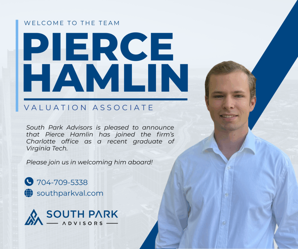 South Park Advisors is pleased to announce that Pierce Hamlin has joined the firm’s Charlotte, NC office as a valuation associate. Pierce is a recent graduate of Virginia Tech. Please join us in extending him a warm welcome!