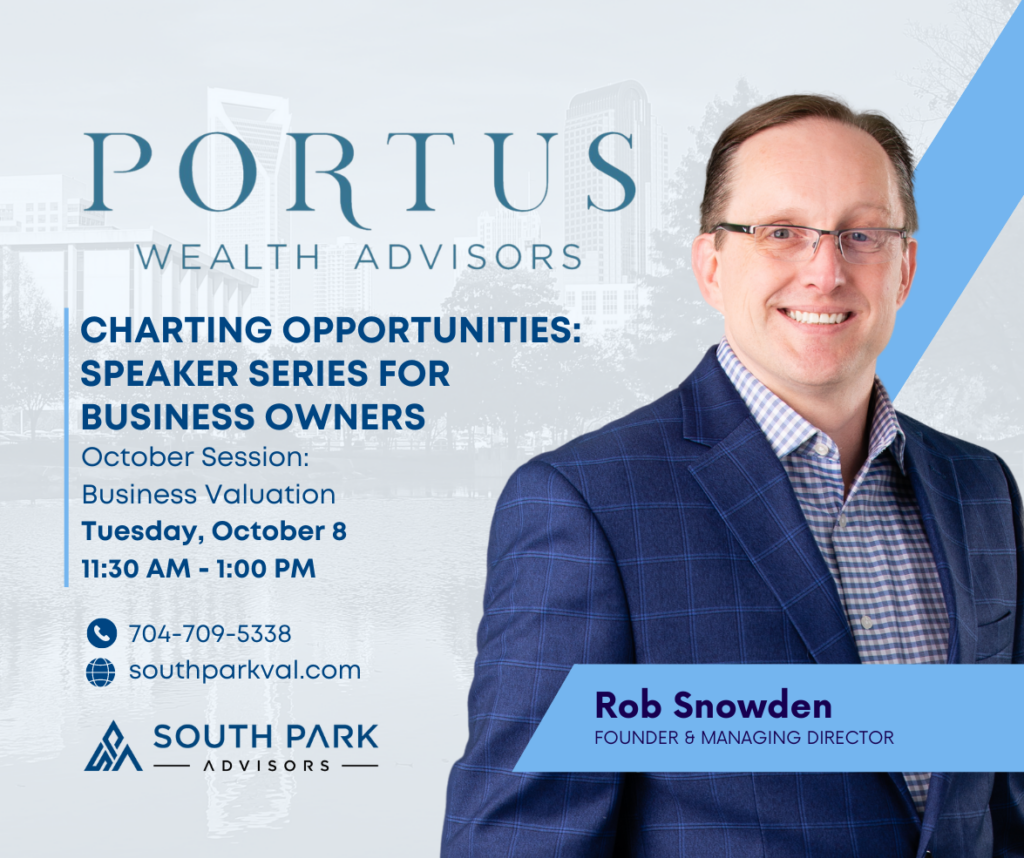 South Park is pleased to announce that our founder, Rob Snowden, will be a guest speaker at a virtual session hosted by Portus Wealth Advisors on Tuesday, October 8th, from 11:30 AM to 1:00 PM. Attendees will learn about the business valuation process and discover ways to maximize business value on their journey to financial independence.